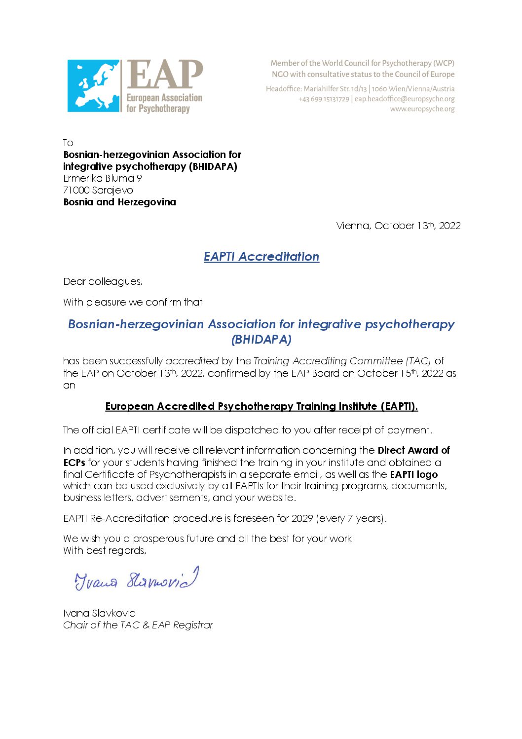 BHIDAPA je registrovana kao Trening Instituta za integrativnu psihoterapiju od strane EAIP-a sa dodatnom specijalizacijom za edukacijski program iz dječje i adolescentne integrativne psihoterapije. Certifikat nam je dostavljen u aprilu 2022. godine.