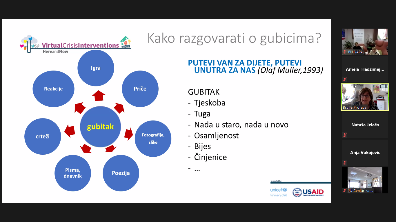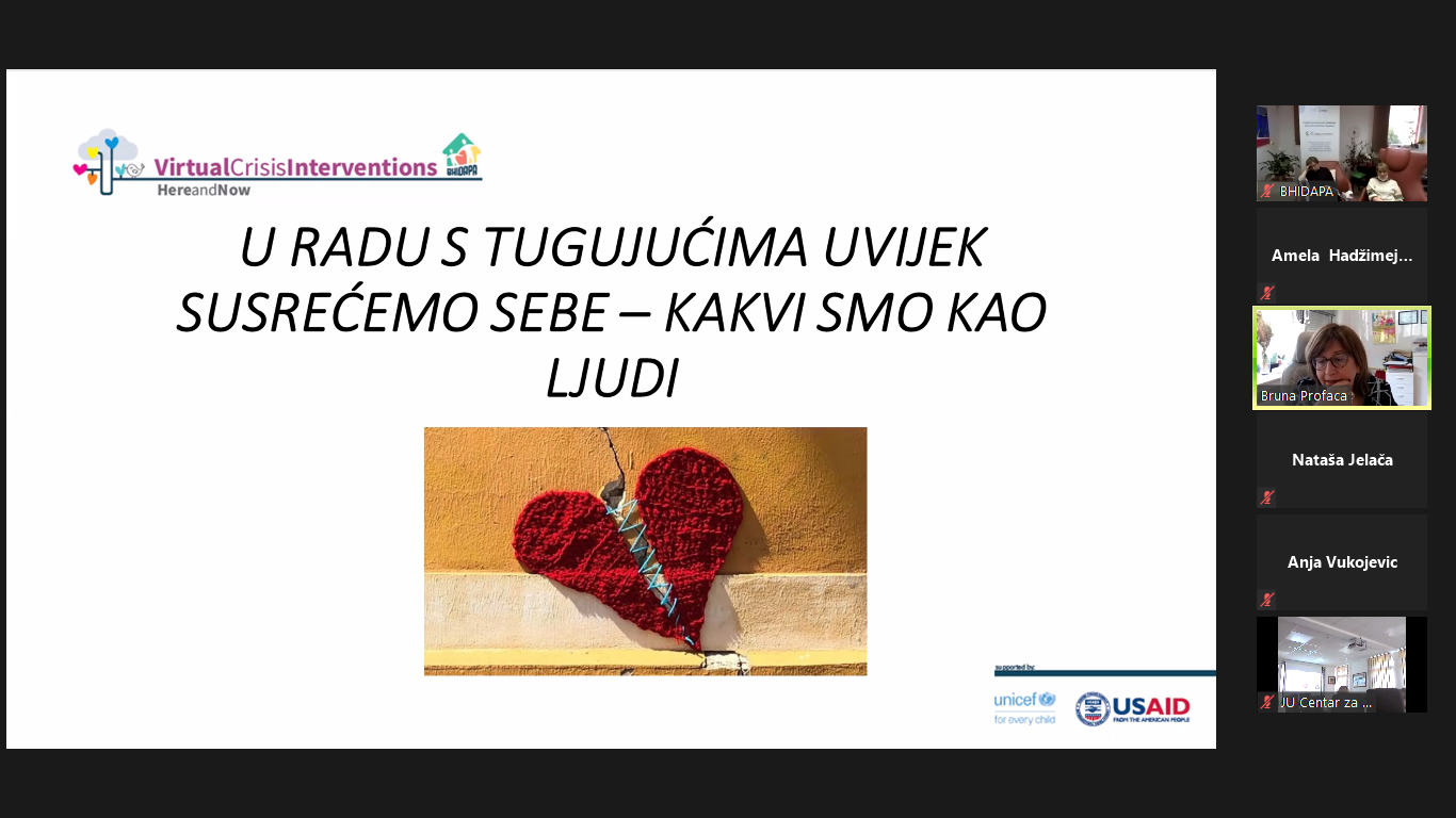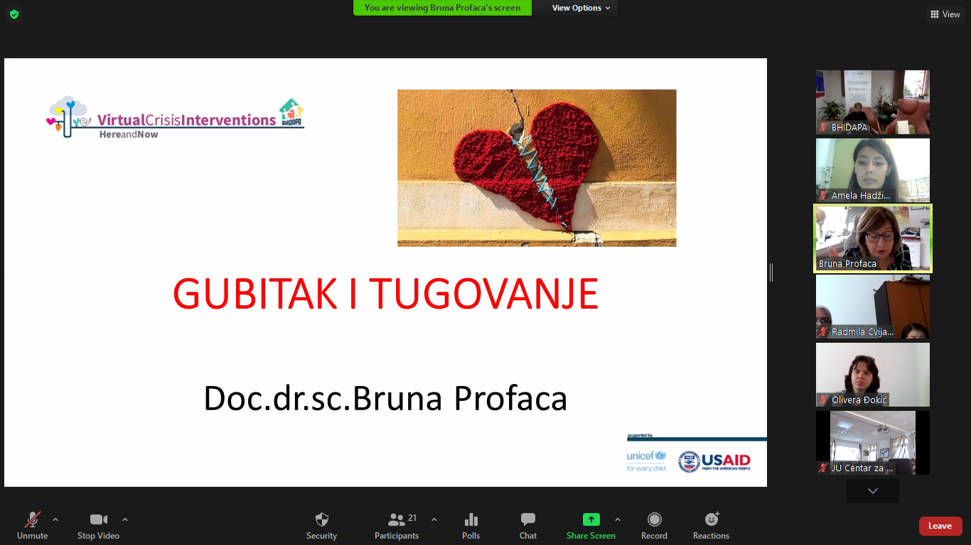 The module on the topic “Loss and grief” within the education of the Virtual Crisis Intervention Here & Now, was held by our dear doc.dr.sc. Bruno Profaca, clinical psychologist from the Polyclinic for the Protection of Children and Youth of the City of Zagreb.