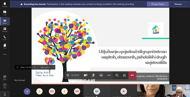 Edukacijski program: Istraživanje, monitoring, refleksija i optimiziranje procesa promjene u psihoterapiji. Organizatori edukacijskog programa su: Europska asocijacija za psihoterapiju EAP, na čelu sa Peter Schulthess, MSc, Chair SARC (Science and Research Committee) i Institute of Synergetics and Psychotherapy Research, Paracelsus Medical University Salzburg. Voditelj edukacijskog programa je uvaženi univerzitetski profesor, Univ.-prof. Dr. Günter Schiepek