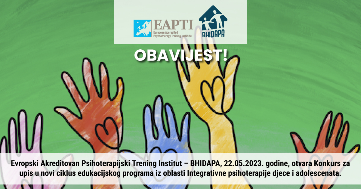 Sa radošću vas obaviještavamo da Evropski Akreditovan Psihoterapijski Trening Institut – BHIDAPA, 22. 05. 2023. godine, otvara Konkurs za upis u novi ciklus edukacijskog programa iz oblasti Integrativne psihoterapije za djecu i adolescente, u Sarajevu u školskoj 2023/2024. godini. Konkur ostaje otvoren do 15.08.2023. godine. Dobro došli!