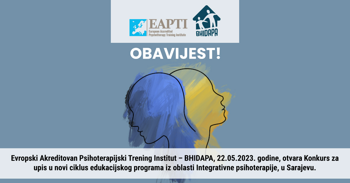 Veselimo se obavijstiti vas da, Evropski Akreditovan Psihoterapijski Trening Institut – BHIDAPA, 22. 05. 2023. godine, otvara Konkurs za upis u novi ciklus edukacijskog programa iz oblasti Integrativne psihoterapije, u Sarajevu u školskoj 2023/2024. godini. Konkurs ostaje otvoren do 15.08.2023. godine. Dobro došli!