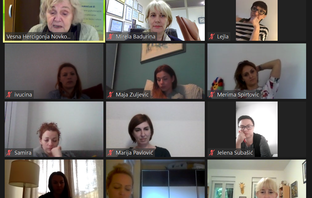 Edukanti četvrte godine edukacijskog programa iz oblasti integrativne psihoterapije za djecu i adolescente nastavili su jačati svoja znanja i vještine u prepoznavanju i adekvatnim intervencijama. Modul na temu: Internalizirani poremećaji kod djece (anksioznost, depresivna stanja, suicidalnost i psihosomatika) održan je od 5.6.-7.6. 2020. godine uz vodstvo uvažene Prof.dr.sc. Dubravka Kocijan Hercigonja, med.sc., dječiji i adolescentni neuropsihijatar i integrativni psihoterapeut. Iako se modul održao preko Zoom platforme BHIDAPAe, bilo je mogućnosti da se obuhvati dinamika modula sa svim svojim elementima od grupnih procesa, teorije, rada u malim i velikim grupama, do završnog ispita. Edukanti su imali priliku istraživati i propitivati svoja do sada usvojena znanja i vještine kroz omogućeni rad na studijama slučaja.