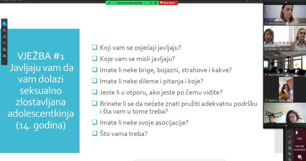U petak 26.04.2024. godine održan je i drugi modul na temu „Seksualno zlostavljanje i posljedice: poseban osvrt na adolescentkinje“ u sklopu šestog ciklusa projekta Interdisciplinarna mreža stučnjaka “Ovdje & Sada”: Zaštitimo Adolescentkinje, fokusirana na preventivne psihosocijalne aktivnosti i intervencije u tretmanu adolescentkinja koje su preživjele zlostavljanje sa fokusom na seksualno zlostavljanje.