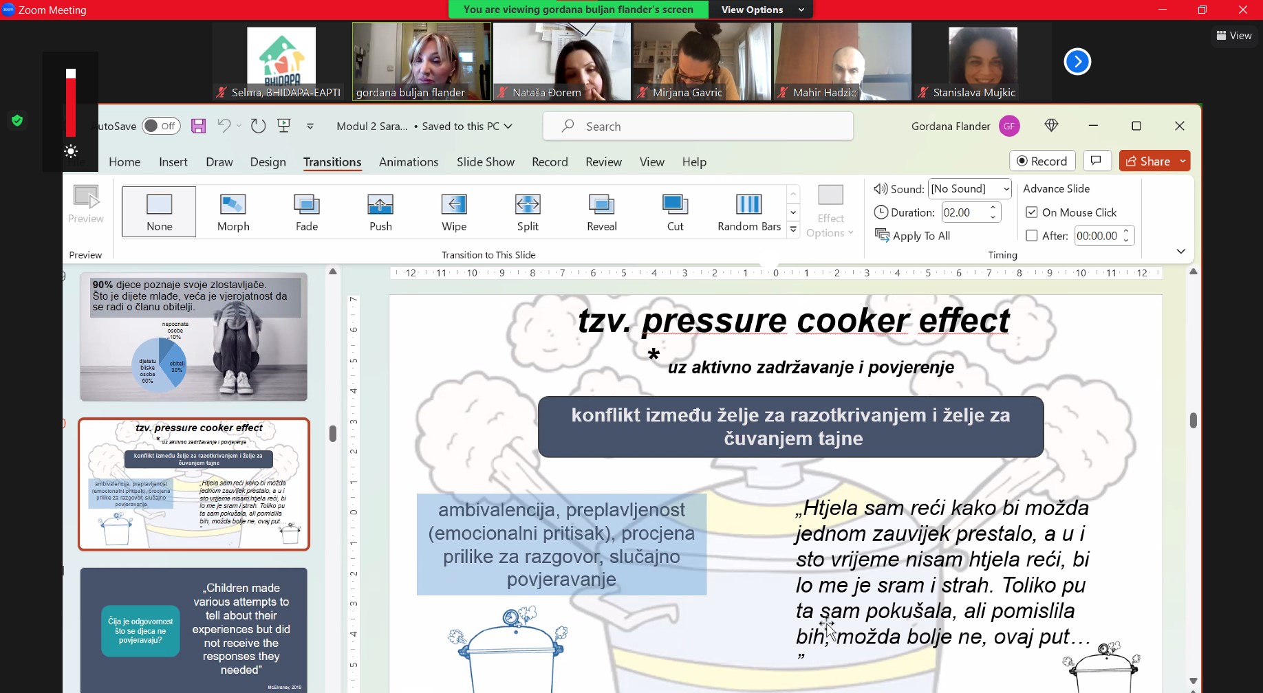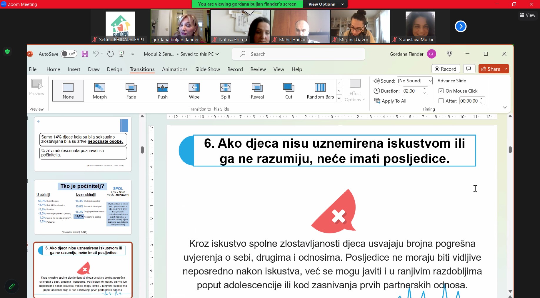 Modul su vodile naše drage, evropski akreditovani treneri – prof. dr. sc. Gordana Buljan Flander, klin. psiholog, psihoterapeut, trener i sudski vještak za zlostavljanu i zanemarenu djecu i Dr. sc. Mirela Badurina, geštalt i integrativni psihoterapeut, integrativni psihoterapeut za djecu i adolescente, trener, mentor i supervizor