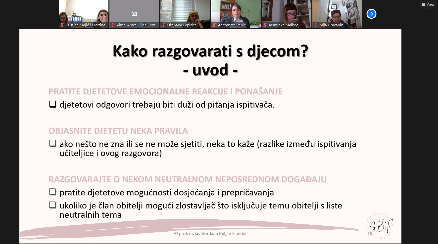 Modul su vodile naše drage, evropski akreditovani treneri – prof. dr. sc. Gordana Buljan Flander, klin. psiholog, psihoterapeut, trener i sudski vještak za zlostavljanu i zanemarenu djecu i Dr. sc. Mirela Badurina, geštalt i integrativni psihoterapeut, integrativni psihoterapeut za djecu i adolescente, trener, mentor i supervizor