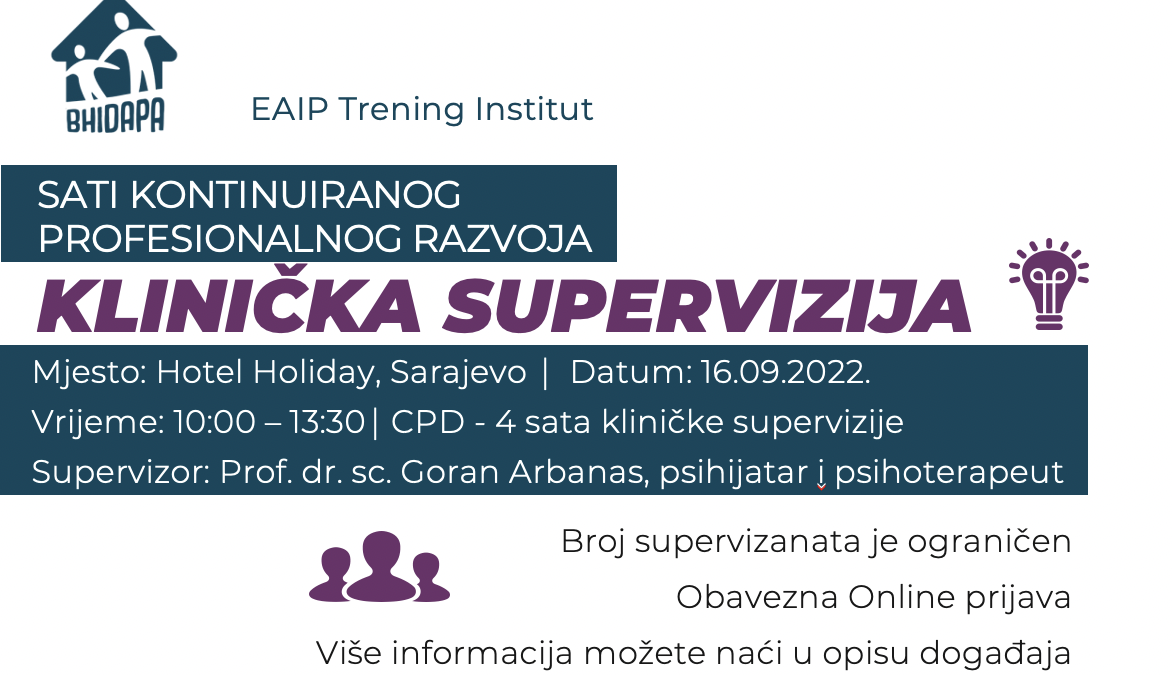 Supervizija će se održati u hotelu Holiday, sala Neretva, u petak 16.9.2022. godine, od 11:oo do 13:30.