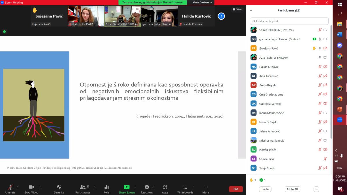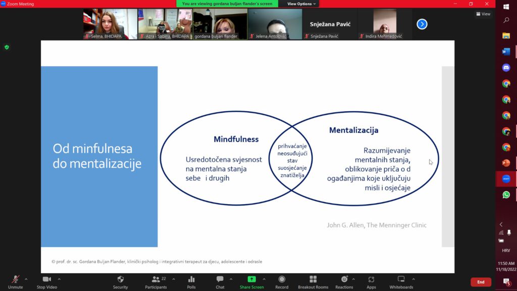 Sa zadovoljstvom vas obavještavamo da je 18.11.2022. godine održan posljednji modul trećeg ciklusa edukacije-treninga u sklopu projekta Interdisciplinarna mreža stručnjaka „Ovdje&Sada“ na temu „Rezilijentnost i mentalizacija“.