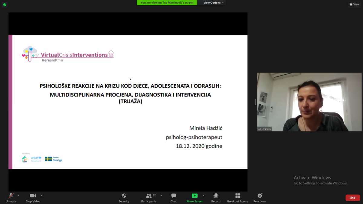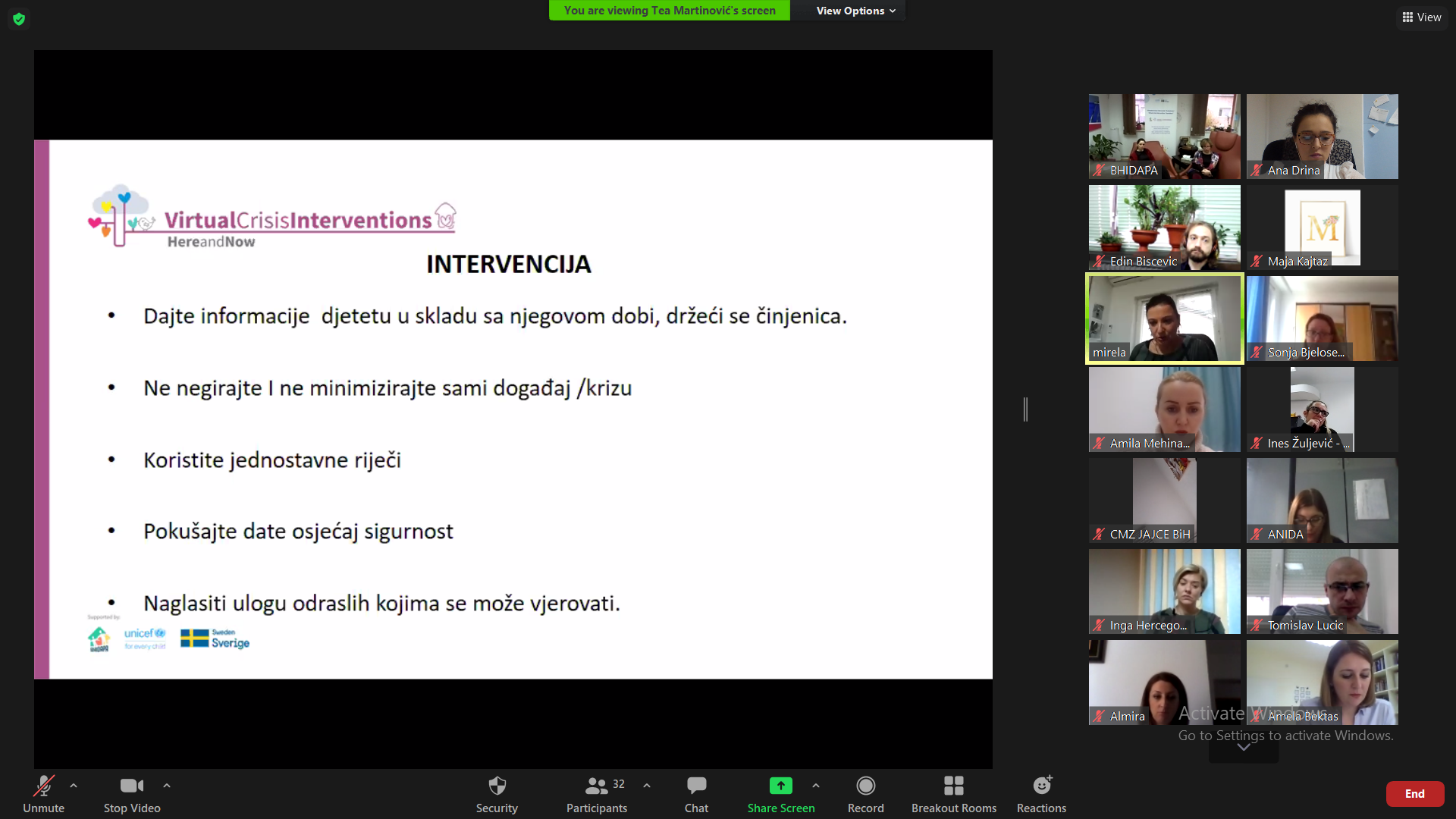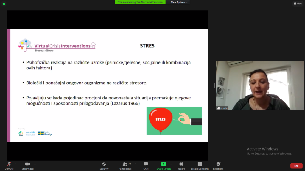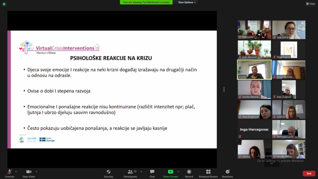 Drugi modul edukacijskog programa Virtualne krizne intervencije „Here and Now“ obuhvatio je upoznavanje učesnika sa očekivanim psihološkim reakcijama na kriznu situaciju i traumatski događaj, s trijažom i značajem multidisciplinarnosti.
