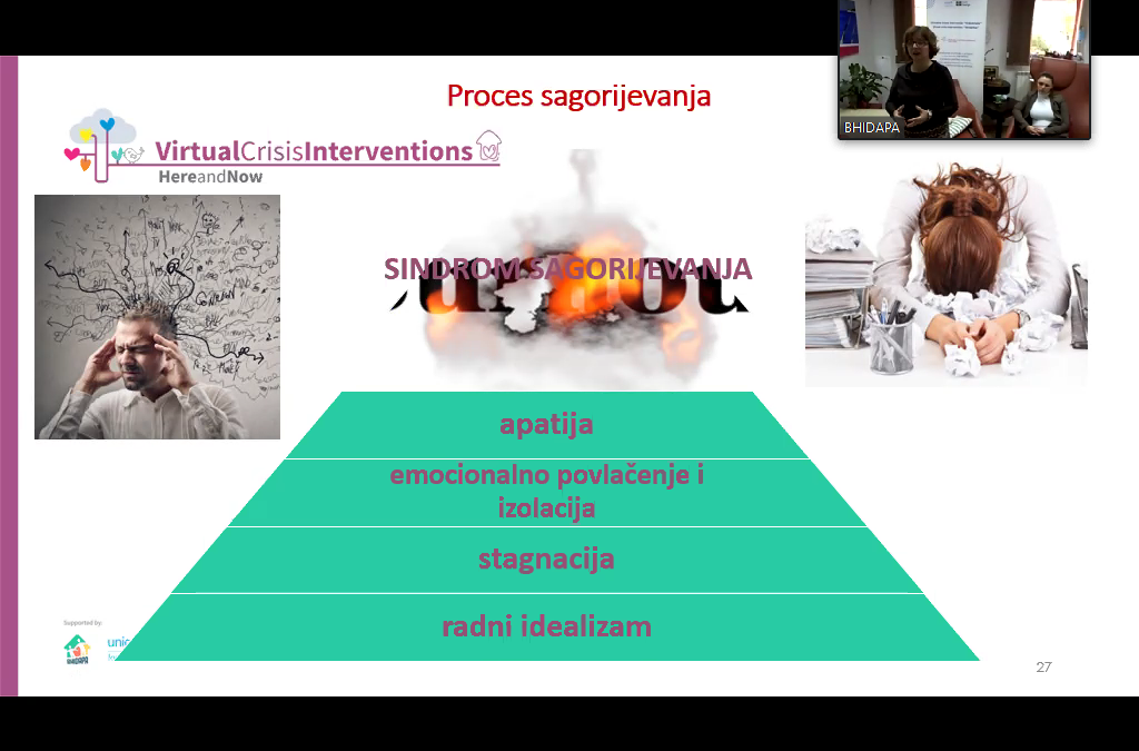 Sindrom profesionalnog sagorijevanja je niz simptoma povezanih sa emocionalnim, kognitivnim i bihevioralnim reakcijama na visoke zahtjeve posla. Pomagači, sva zanimanja vezana za pružanje pomoći ljudima su posebno izloženi profesionalnom sagorijevanju, rad u krizi i primjena kriznih intervencija je visoki rizikofaktor za razvoj sindroma profesionalnog sagorijevanja. U kreiranju edukacijskog programa Virtual crisis interventions Here and Now, je osmim modulom imao za cilj prevenciju sindroma profesionalnog sagorijevanja.